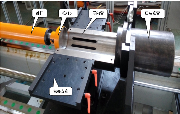 然后雙手將包裹好襯墊后的載體推入壓裝錐套后,點(diǎn)擊啟動(dòng)按鈕,夾緊氣缸動(dòng)作筒體夾緊對(duì)中,錐套氣缸動(dòng)作與客體貼緊,伺服電機(jī)動(dòng)作帶動(dòng)推桿前移,推桿頭通過壓裝錐套導(dǎo)向,將包裹襯墊的載體壓入殼體內(nèi)部,壓裝到位后各裝置復(fù)位,完成一次壓裝工序。